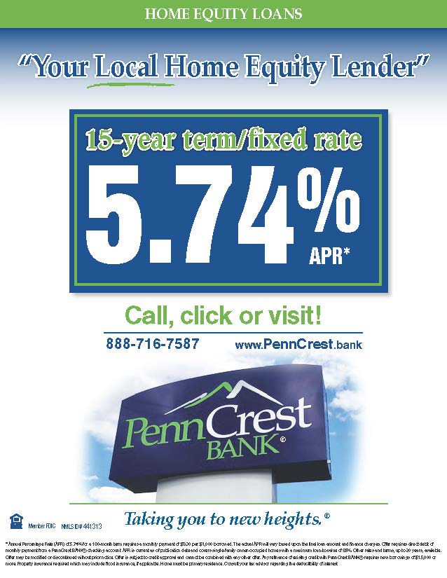 * Annual Percentage Rate (APR) of 5.74% for a 180-month term requires a monthly payment of $8.30 per $1,000 borrowed. The actual APR will vary based upon the final loan amount and finance charges. Offer requires direct debit of monthly payment from a PennCrest BANK® checking account. APR is current as of publication date and covers single-family owner-occupied homes with a maximum loan-to-value of 85%. Other rates and terms, up to 20 years, available. Offer may be modified or discontinued without prior notice. Offer is subject to credit approval and cannot be combined with any other offer. Any refinance of existing credit with PennCrest BANK requires new borrowings of $15,000 or more. Property insurance required which may include flood insurance, if applicable. Home must be primary residence. Consult your tax advisor regarding the deductibility of interest.